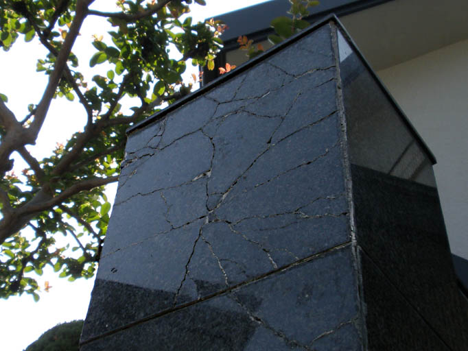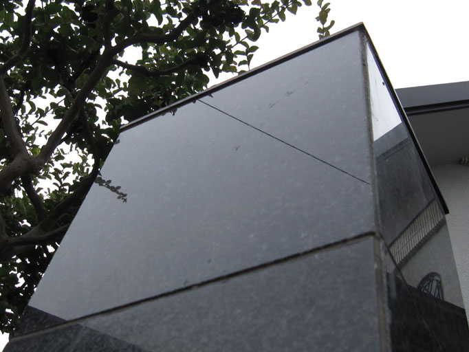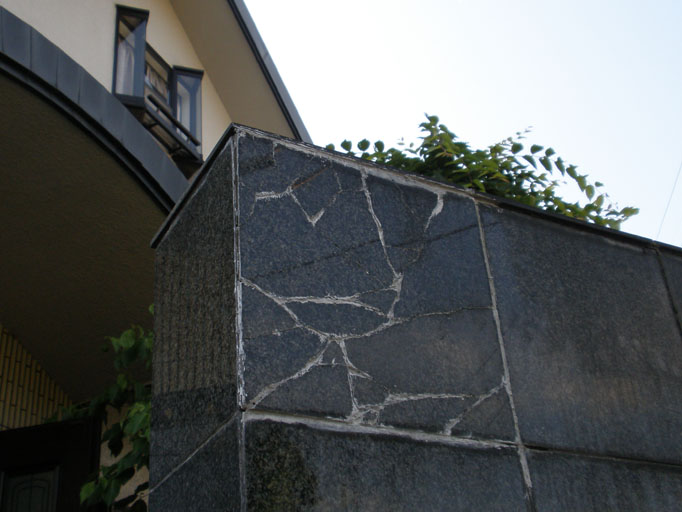 部屋のクロスの張替えをしてくれた人は家を買った時からの親しい人で、 ひどいことになっている門を見かねて石屋さんを紹介してくれました。 やはり同じ石はないが目立たないようには出来るということでした。 以下がきれいになった門です。本当によく似た石で、目立ちません。 斜めの線はひび割れではなく電線が映っているのです。