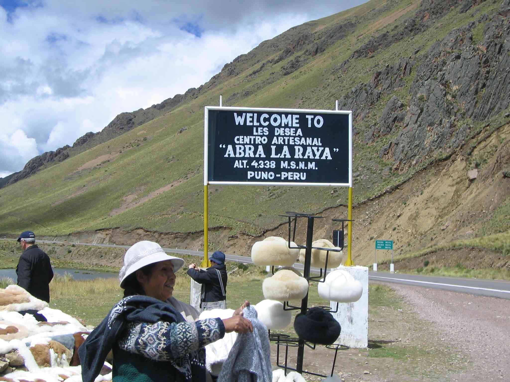 この後プーノからクスコまで約8時間のバス旅行です。長距離バスなのですが観光案内付きです。プーノにはバスターミナルが(少なくとも)3カ所ありバス会社によって違います。ホテルからタクシーでわたしが乗るバスが出る筈のバスターミナルに行ったら 実は間違っていました。幸い十分早く着いたので1KM離れた正しいターミナルまで別のタクシーで行けました。距離が短いので2ソルで行ける約束だっのに5ソル硬貨を出したら1ソルしか返して呉れません。運ちゃんとやり合っていたら通行人が仲裁に入ってくれてもう1ソル渋々返して呉れました。一般的にタクシーに乗る時は小銭を持っていないと往々にしてこういう事態になるそうです。これからクスコまでの道のりで標高4300Mの峠を越えることになります。 |