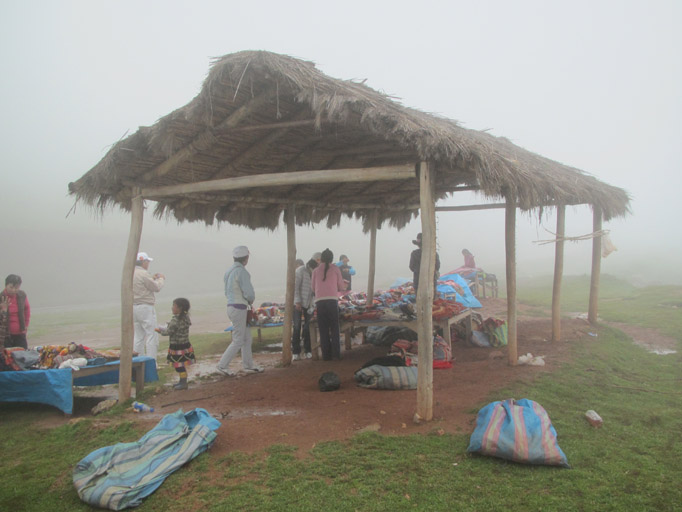 標高の高い峠ではバスが停まるからお土産屋さんが出るのですね。 私達も、マチュピチュからクスコへ帰る高原列車をオリャンタイタンボ駅で降りて、 クスコへ向かうバスが標高4000m地点で停まりました。 景色が良い場所だそうで停まったのですが、その日は霧で何も見えませんでした。 でも、その霧の中で子連れの地元の人が開いている露店で買い物をしました。