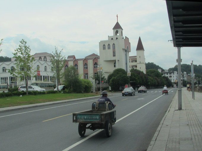 ・近代的な教会の建物を背景にリヤカー?が行くアンバランス。