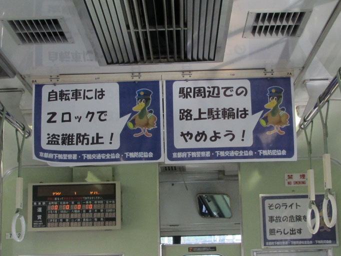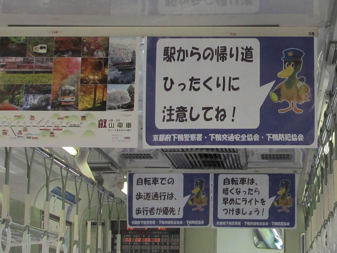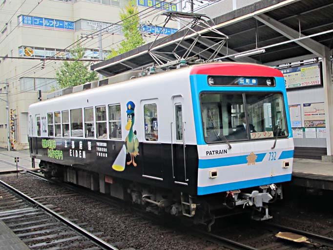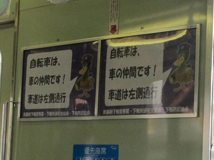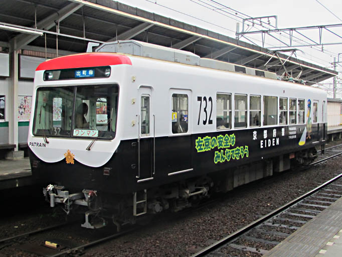 この叡電の車体には、いろいろ絵が描かれていて楽しいのですが、 9月頃からパトカー電車が走り始めました。 下鴨警察署のマスコット「シモガーモ」が描かれています。 車両の前面・側面で異なるデザインです。
