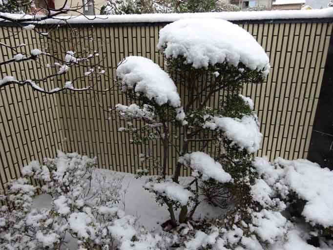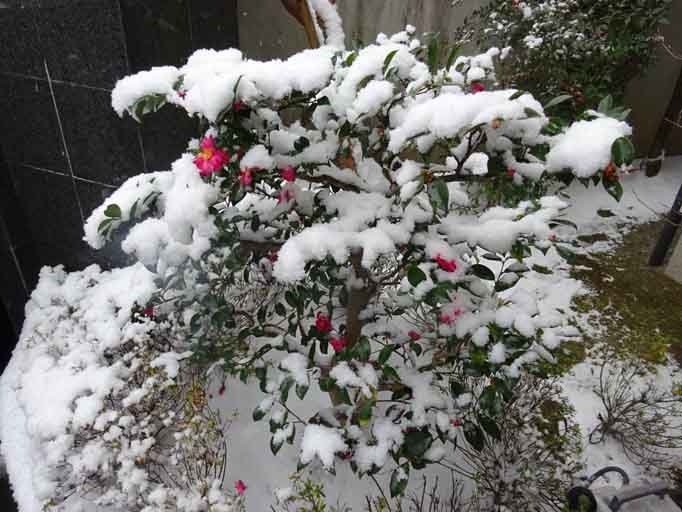 雪の多かった朝の内に写真を撮っておこうと思ったのに、 ダスキンの人が来て対応に追われている内に忘れてしまい、 お昼を過ぎてから撮ったので雪は少し融けかかっています。
