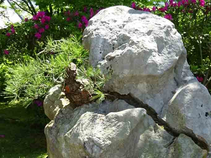 「人の一念岩をも通す」。岩を砕いて松が生えています。