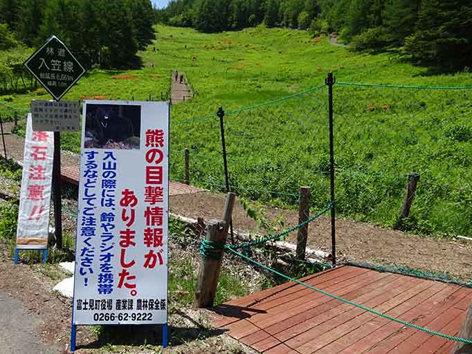 ヒグマに関するレクチャーっていうのを受けるのですか。 本年度入林第1号で入られたのですか! 話題性ありますね。 ヒグマに遭遇していたら、もっと話題性があったのに…。(^^;) 入笠山でも写真のようにこんな看板がありました。