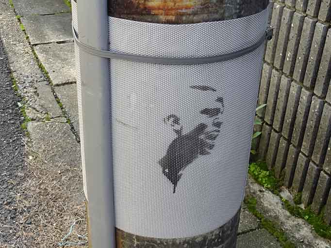 帰り道で見つけた電柱に巻かれた男性の顔に見える絵です。