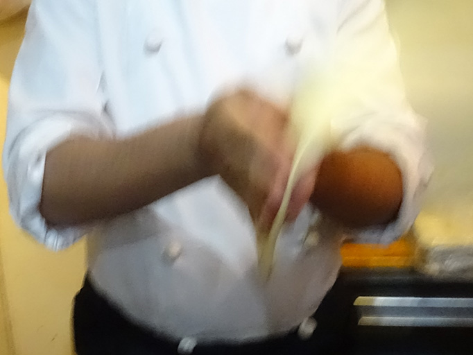 ・調理台の上で、丸めて置いた生地を少しずつ手で伸ばしていく。