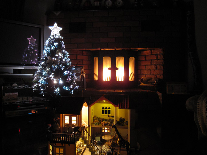 写真は、ツリーを飾り暖炉を焚いていた頃の写真ですが、 手前は、動物たちを一杯置いた玩具の家だと思います。