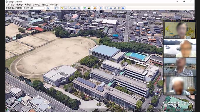 そこで、今回はみんなで Google Earth で母校を眺めました。