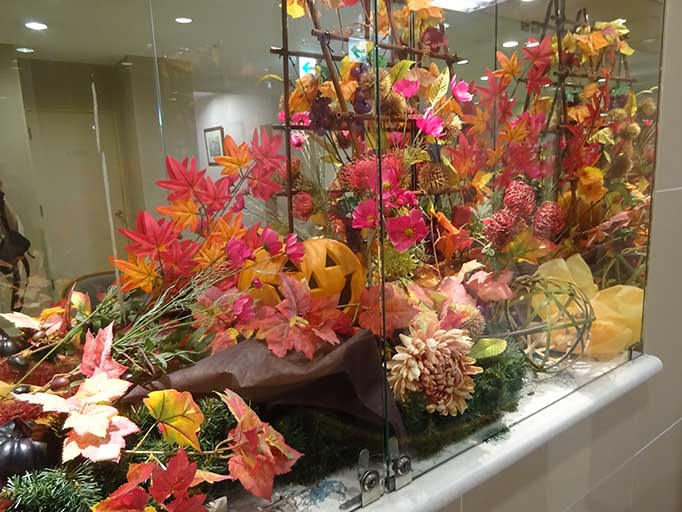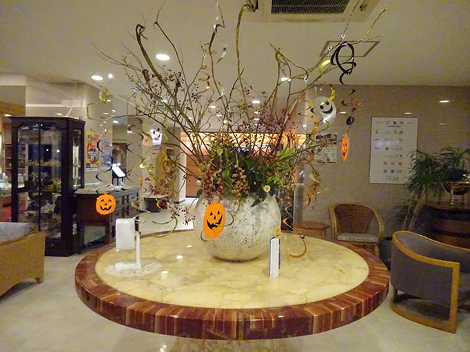 22日から1泊で相生へ行ってきました。 旅行はコロナで自粛していて、本当に久しぶりの1泊旅行でした。 泊まったホテルにあった飾りですが、早くもハロウィンの飾りがありました。 でも、ずいぶんと控えめな飾りでした。 2枚目は、よく見ると、花の中に見つけられます。