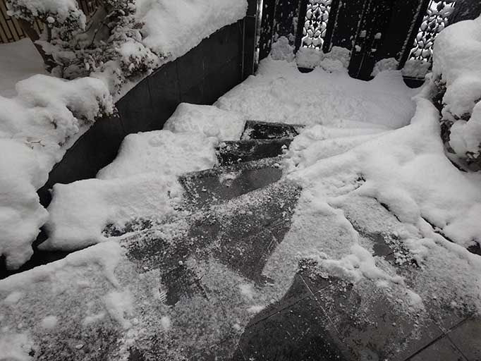 階段が滑って危ないので、歩く所だけ階段の雪かきをしました。