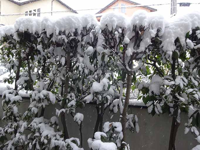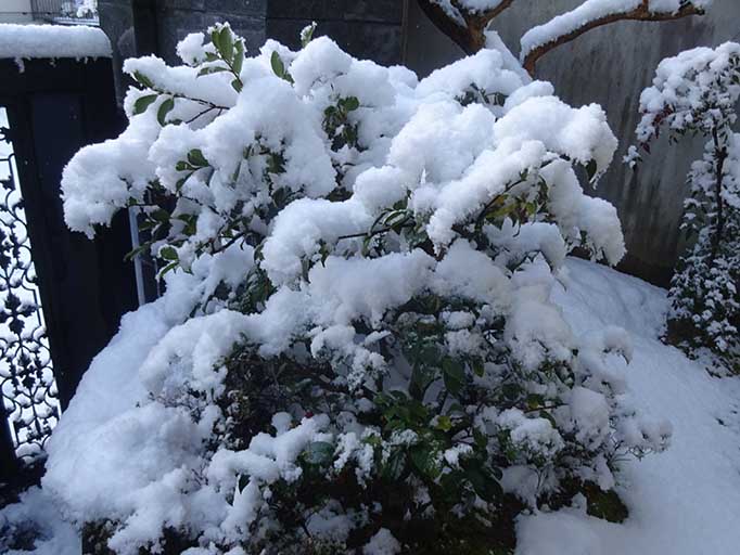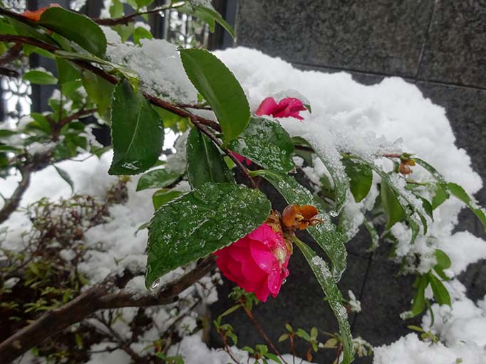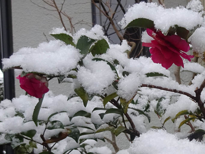 写真2枚目は、同じ場所で撮ったサザンカに積もった今朝の雪です。