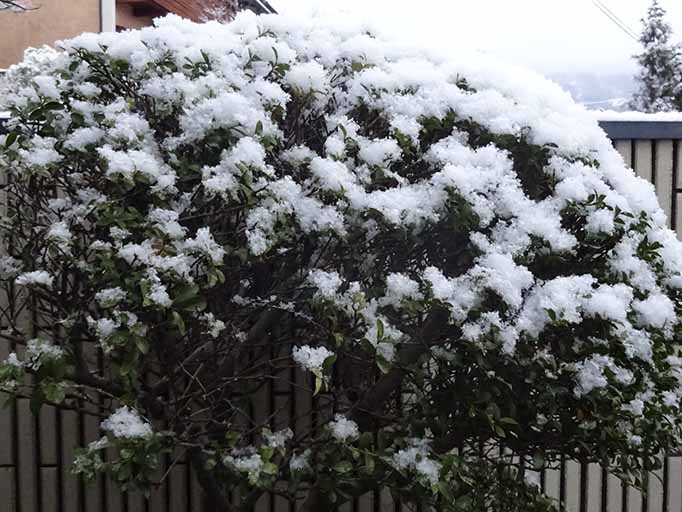 この前よりは少し少なめの今朝8時過ぎのサザンカの雪ですが、