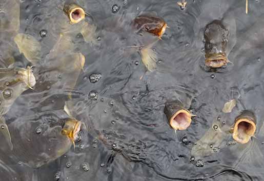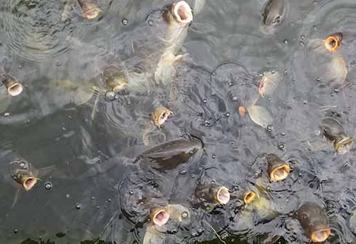 寄ってきたコイ達が口を開けて