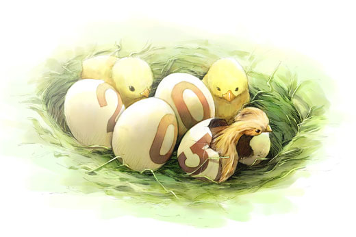 今年の絵は「酉(鳥・鶏)がパソコンを」していません。